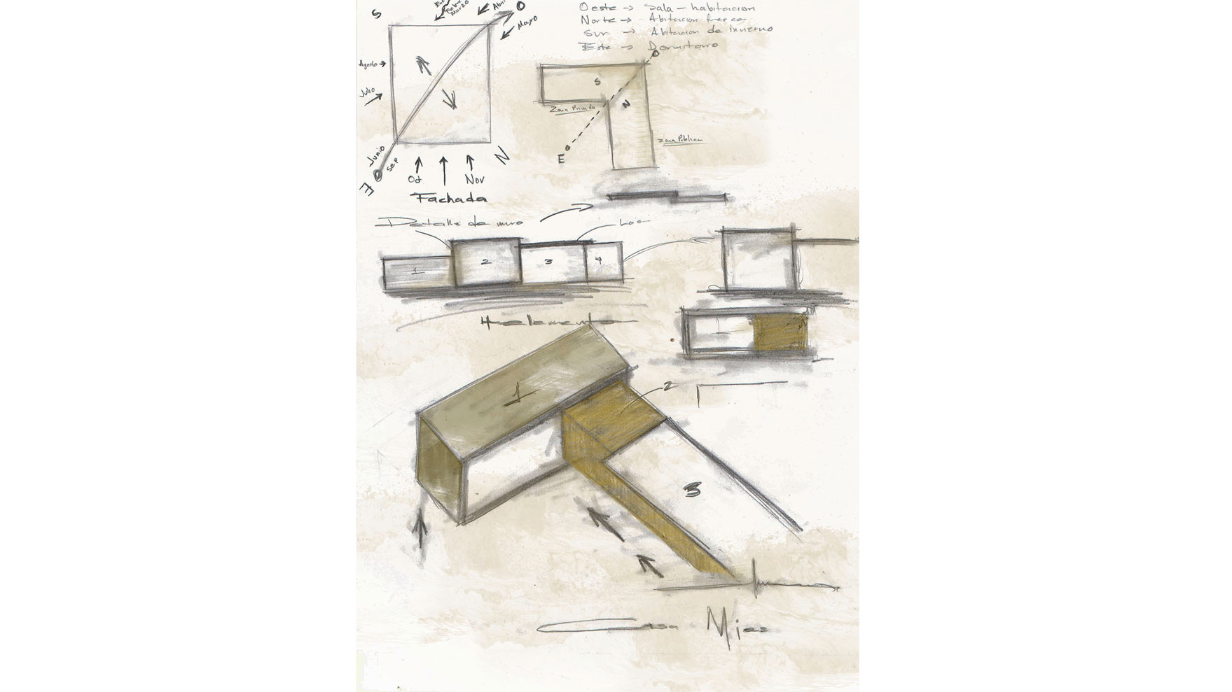 El proyecto se organiza en dos volúmenes principales dispuestos de manera perpendicular en madera, separando con claridad las áreas públicas de las privadas. Los muros en tono blanco ostión refuerzan la sobriedad del conjunto, mientras que un recubrimiento de mármol verde envuelve el área de servicio otorgándole carácter y privacidad.