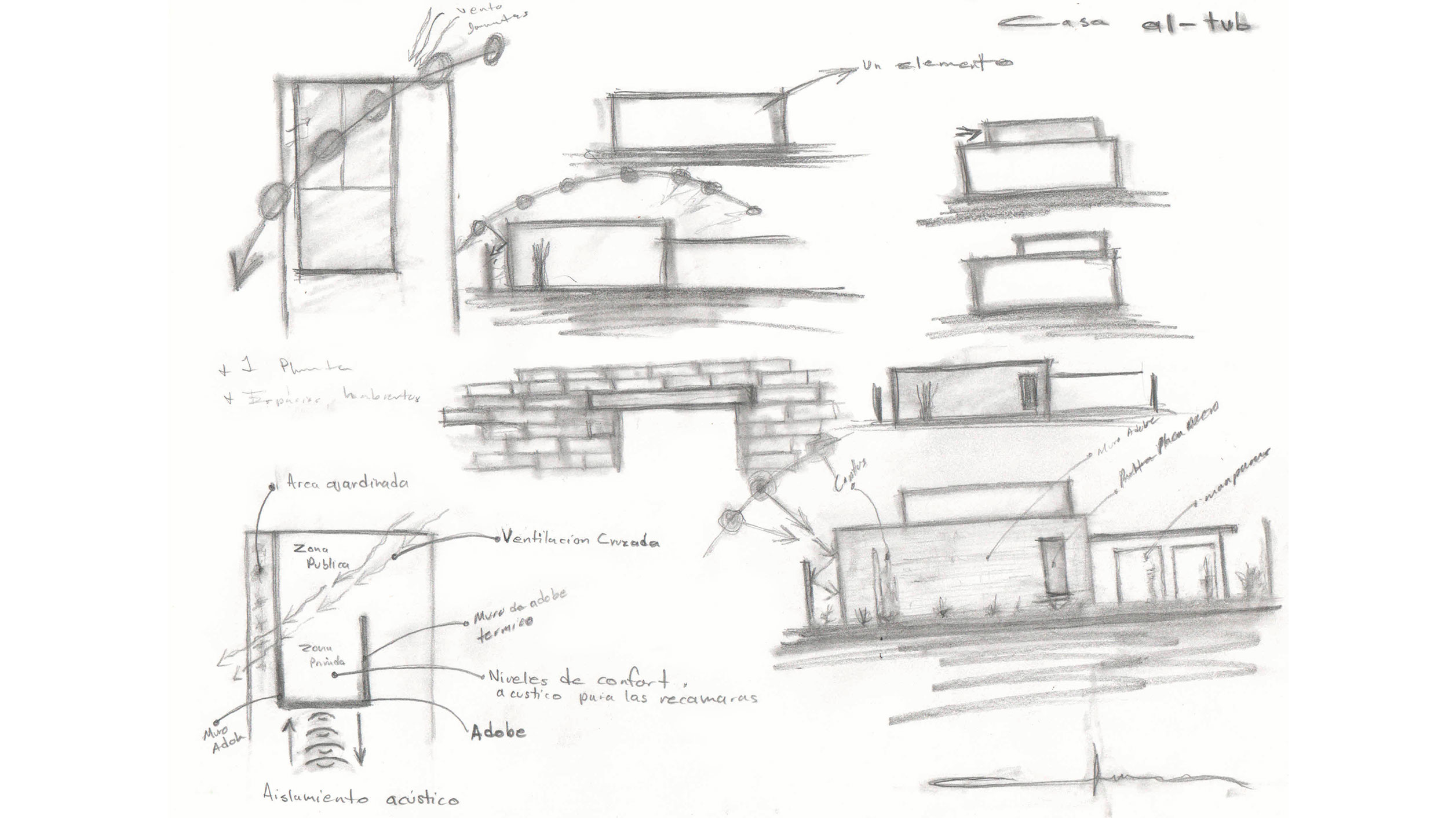 La nobleza del adobe, extraído de la propia región, da cuerpo a los muros que protegen la intimidad del hogar y al mismo tiempo se convierten en protagonistas de la fachada principal. Su cualidad térmica envuelve los espacios con frescura y calidez, evocando la sabiduría de generaciones pasadas, complementándose así, con un jardín desértico.